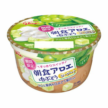 グリコ『朝食アロエ&白ぶどうヨーグルト』は、グリコのロングセラーヨーグルト、定番ヨーグルトである『朝食りんごヨーグルト』の期間限定の『アロエ&白ぶどう』版です。